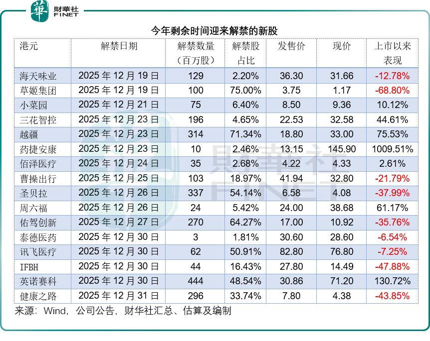 根据我们的统计,2025年12月16日至31日,将有超过十家上市公司的重要股东持股陆续解禁,包括海天味业(03288.HK)、草姬集团(02593.HK)、$三花智控(HK2050)、$越疆(HK2432)、$药捷安康-B(HK2617)、曹操出行(02643.HK)、周六福(06168.HK)、英诺赛科(02577.HK)等等,涉及股份数量从数百万到数亿股不等。市场普遍关注,这批“解锁”的股份会否引发抛售潮,进而冲击相关个股乃至大市表现。